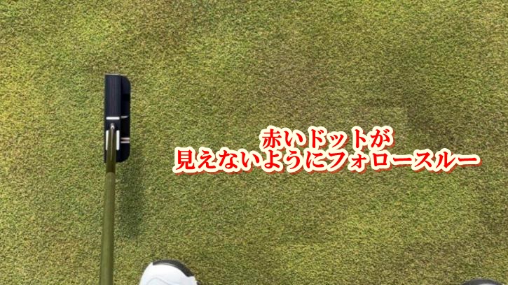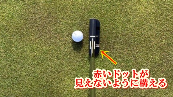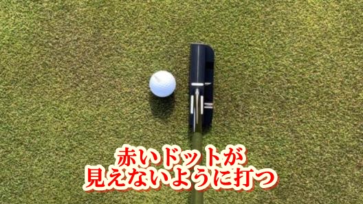 解説と言ってもその理由は物凄くシンプルで、シーモアパター(SeeMore Putter)の特許でもある赤いドットの部分をシャフトで見えないように隠して、①アドレス→②テイクバック→③インパクト→④フォロースルーまでを行うだけです。